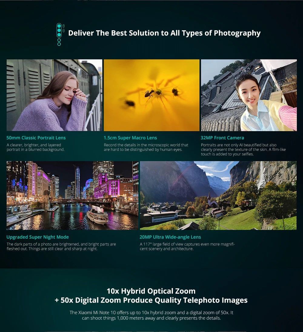 Szokás szerint partnerünk, a Gearbest akciózik méreteset, amelynek főszereplője ezúttal a Xiaomi Mi Note 10 Pro, avagy a 2020-as legerősebb fotózási tudású okostelefon a kínálatban. A Mi Note 10 Pro különlegessége a 108 megapixeles, optikai képstabilizátorral is ellátott fő hátlapi kamera, ezt egy 20 megapixeles ultraszéles látószögű, egy 12 megapixeles portré, egy 5 megapixeles „hagyományos” teleobjektív és egy 2 megapixeles makro fotózáshoz használható érzékelő egészíti ki. A 12 megapixeles szenzor kétszeres optikai zoomra képes, míg az 5 megapixeles teleobjektív tízszeres hibrid és ötvenszeres digitális zoomot és optikai képstabilizátort is biztosít.