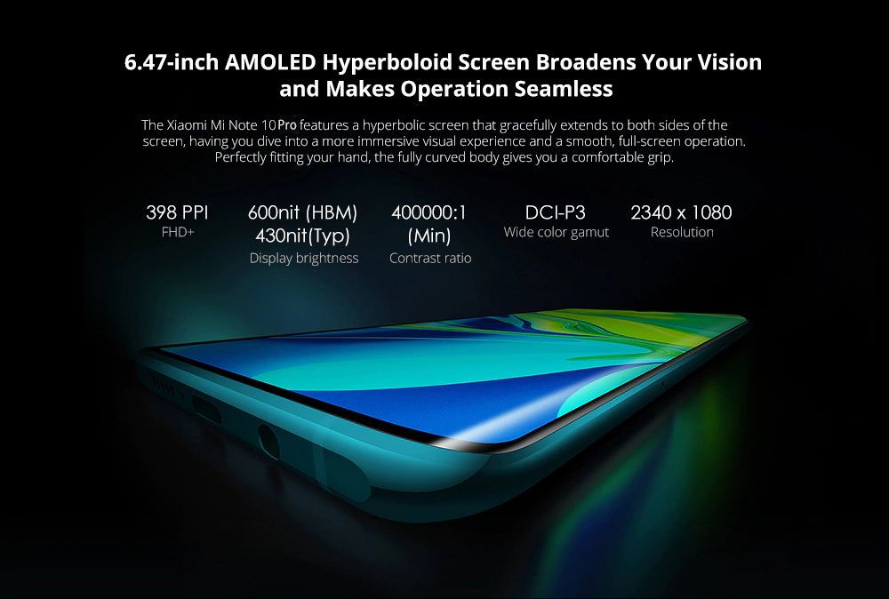 A 6.47 colos kijelző 3D hajlított oldalt, AMOLED alapokon biztosít 2340×1080 pixel felbontást. A Mi Note 10 Pro Android 10 alapú MIUI rendszerrel érkezik, ez alatt a Snapdragon 730G chipset dolgozik nyolc maggal, Adreno 618 grafikus gyorsítóval, 8 gigabájt RAM és 256 gigabájt tárhely mellett, némi meglepetés, hogy ez utóbbi nem lesz bővíthető.