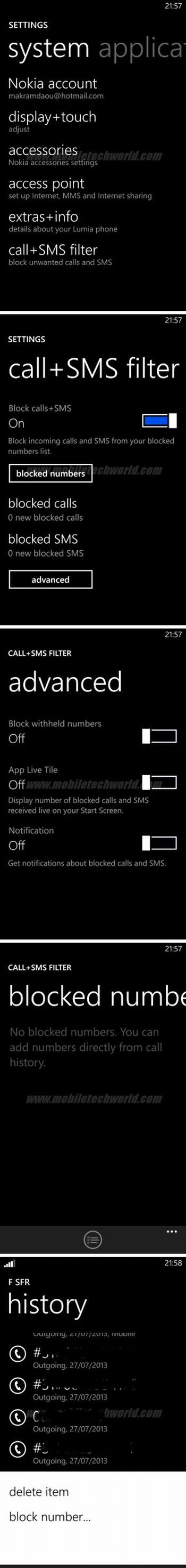 Évek után végre elérhető egy alapvetőnek mondható funkció a finn gyártó Nokia Lumia Windows Phone 8-as készülékeire. A sokak által használt funkció a telefonszám és/vagy SMS tiltás. A feketelista a Windows Phone 8 modellek Extrák menüpontjában érhető el a beállításokban, ahol könnyedén beállítható bármilyen telefonszám letiltása. Plusz lehetőségként a főképernyőre csempeként is kitehető a letiltott hívások és üzenetek száma, ez a megoldás anno a Symbianos Nokiákon közkedvelt volt. A Windows Phone 8 GDR2 avagy Amber update tartalmazza majd ezt az új funkciót (érdekesség: a Samsung a feketelistát már a Windows Phone 7-ben is elérhetővé tette).