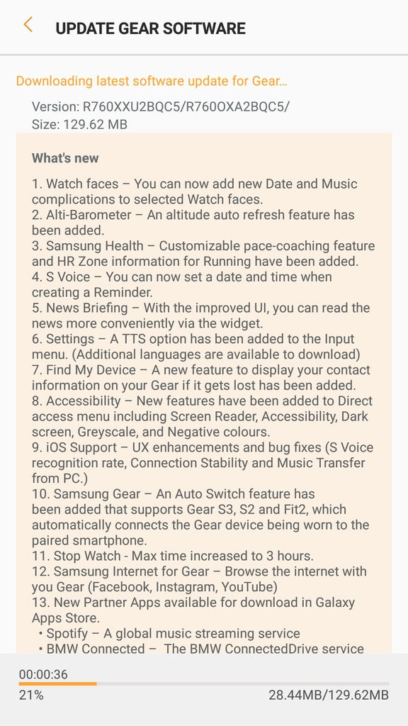 A legújabb szoftver R770XXU2BQC5 vagy R760XXU2BQC5 néven fut attól függően, hogy Gear S3 classic vagy frontier modellre töltjük le őket. Az új Dátum és Zene alkalmazások új watch face-en jelennek meg, ezzel együtt megjelent egy új automatikus frissítési funkció, valamint testre szabható az edzés több részlete. Az S Voice immár lehetővé teszi a dátum és az idő hozzáadását emlékeztető hozzáadásakor, a News Briefing pedig küllemében újult meg.