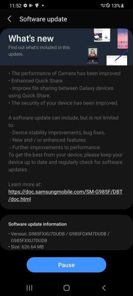 A legújabb Galaxy S20 frissítés célja a kamera általános teljesítményének a fejlesztése volt. Bár ez bármit jelenthet, beleértve a képminőség javítását vagy akár a feldolgozási sebességet, azt legalább tudjuk, hogy valami még jobban fog működni. Ettől eltekintve a frissítésnek javítania kell a Gyors megosztást használó Galaxy készülékek közötti fájlmegosztást is. A telefon biztonsága most is naprakész a májusi biztonsági javításnak köszönhetően.