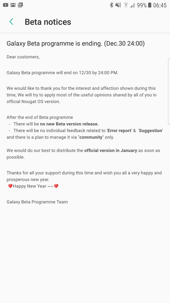 A kínai Twitterre felkerült információk szerint ma, tehát 2016. december 30-án, éjfékor ér véget hivatalosan is a Samsung béta tesztelő programra, amire hivatalos tesztelők mellett felhasználókat is felkértek. Összesen öt verziót tesztelhettek le a szerencsések az Android 7.0 Nougat rendszerből. A Samsung minden résztvevőnek megköszöni a segítséget. Több béta Nougat OS nem lesz, így már nincs szükség a hibák és javaslatok visszajelzésére sem, innentől a feedback már csak a közösségen keresztül küldhető be a céghez. A Samsung Galaxy S7 és S7 edge modellekre januárban érkezik az Android 7.1.1 verziószámú rendszer.