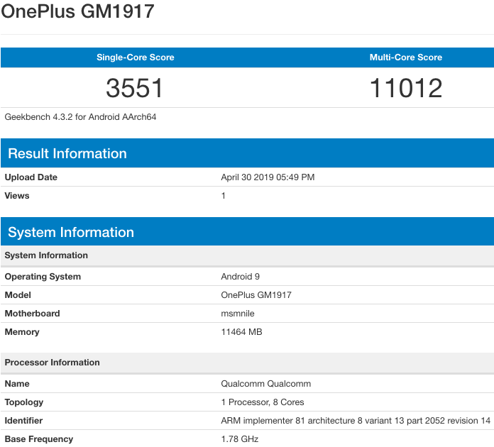 A várakozásoknak megfelelően a OnePlus 7 Pro változata a Qualcomm Snapdragon 855 octa-core processzoron fut Adreno 640 GPU-val. Még lenyűgözőbb az, hogy az eszköz 12 GB RAM-mal rendelkezik. A nagyteljesítményű belsőnek köszönhetően a OnePlus 7 Pro 3,551 illetve 11,012 pontot ért el a Geekbench teszten. A zászlóshajó OnePlus készülék az Android Pie-alapú OxygenOS-szel debütál.