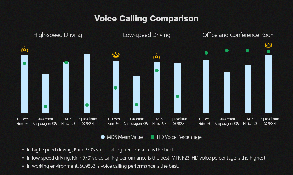 Ami a hanghívások minőségének összehasonlítását illeti, a Spreadtrum SC9853I-t csak a Kirin 970 tudta überelni.