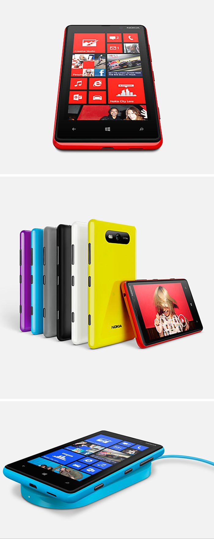 A Nokia Lumia 820 szintén WP8-at futtat, ehhez jár ugyanaz a kétmagos, 1.5 gigahertzes Qualcomm Snapdragon processzor mint a nagytestvérhez, a megjelenítõ egy 4.3 colos, 480×800 képpont felbontású ClearBlack OLED változat. A hátlapi 8 megapixeles kamera Carl Zeiss optikát kapott, ám PureView márkát nem, ennek ellenére jár hozzá egy dupla LED vaku és képes szintén 1080p felbontású filmek rögzítésésre. Az elõlapi kamera VGA felbontású, a microSD kártyával bõvíthetõ beépített háttértár 8 gigabájt, itt is jár a 7 gigás SkyDrive tárhely, RAM-ból pedig 1 gigabájt áll a felhasználók rendelkezésére, de nem maradt ki a vezeték nélküli töltés és egy 1650 mAh-s akkumulátor sem. A Lumia 820 cserélhetõ hátlapú és piros, sárga, szürke, lila, ciánkék, fehér és fekete színekben lesz megvásárolható. A megjelenés pontos ideje és az ár itt sem ismert.