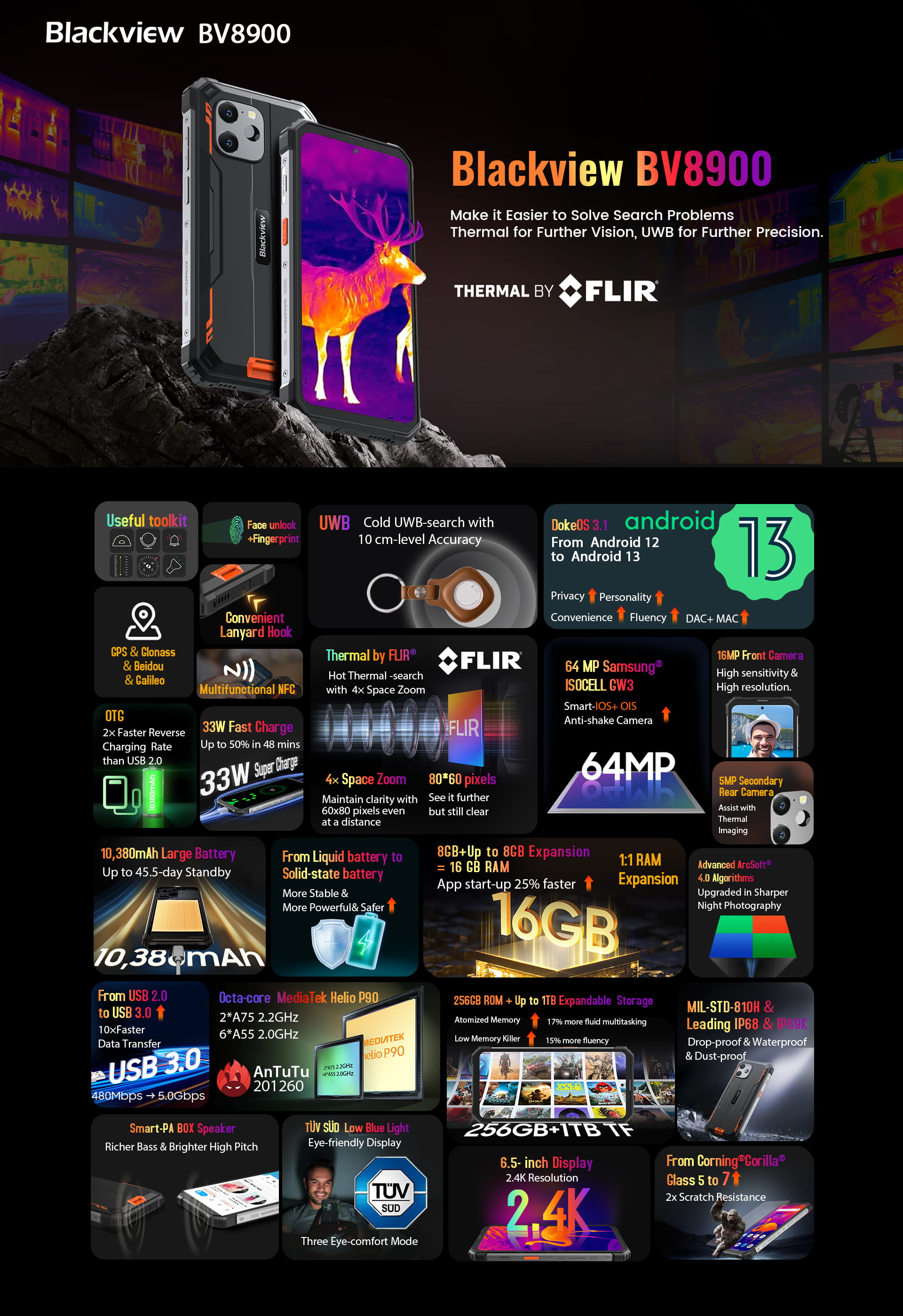 Miután a piacon óriási visszhangot váltott ki az előző, BL8800 Pro hőkamerával ellátott modell, a legújabb Blackview BV8900, szintén hőkamerával ellátott modell négy jelentős frissítésen esett át először, köztük a 4× térbeli zoomos hőkamerával történő praktikussági frissítésen, az ArcSoft 4.0-val történő fényképészeti frissítésen. 0-alapú hármas kamerával, a robusztussági frissítéseket a 10 380 mAh-s szilárdtest akkumulátorral és a Corning Gorilla Glass 7 üveggel, valamint a folyékonysági frissítéseket az Android 13-on alapuló DokeOS 3.1 és a MediaTek Helio P90 segítségével oldották meg.