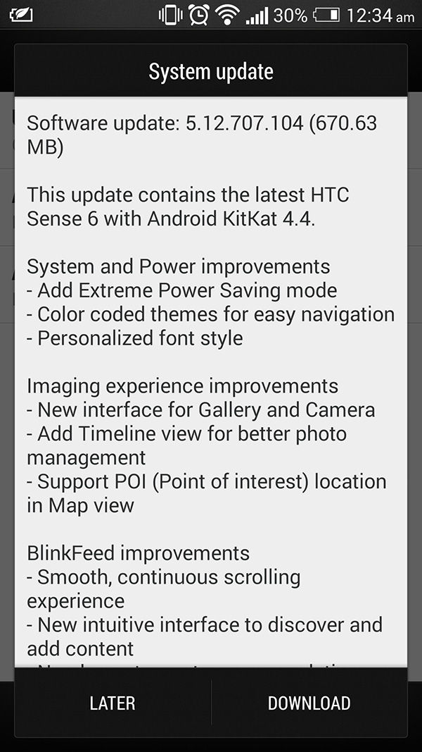 A tajvani gyártó megerősítette, hogy hamarosan érkezik a HTC One M7 frissítése, amely a nagyon várt Sense 6 kezelőfelületet is tartalmazza. A hírek szerint legkésőbb a hónap végéig útnak indítják az update-et, amely a tengerentúlon már hetekkel ezelőtt megjelent a gyári független és a fejlesztői modellekre. A lenti screenshot egy indiai felhasználótól érkezett a GSM Arenához és egyértelmű, hogy olyan extra funkciók érkeznek a frissítéssel még mint az Extreme Power Saving mód, a színes témák, a személyre szabható betűstílus, teljesen megújult kamera és galéria kezelőfelület, továbbfejlesztett BlinkFeed és néhány egyéb apróság.