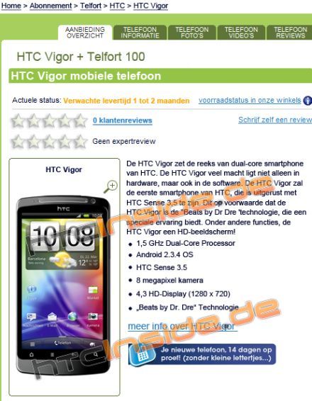 A tajvani gyártó HTC Vigor nevű, múlt héten lebukott telefonjáról új képet és komoly tudáslistát is bemutathatunk már. Az információt egy holland oldalnak köszönhetjük, amely azért meglepő, mert jelenlegi információink szerint a Vigor az amerikai Verizon szolgáltatónál lesz megvásárolható. A HTC Thunderbolt utódjaként is emlegetett okostelefon 4.3 colos, 1280×720 képpont (!) felbontású érintőkijelzőt, 1.5 gigaherztes, kétmagos processzort mondhat magáénak. Az Android 2.3.4 Gingerbread operációs rendszerre szokás szerint Sense kezelőfelület kerül, ezúttal a 3.5 verziószámú, a hátlapi nyolc megapixeles kamera pedig természetesen 1080p felbontásban is képes videót felvenni. Említést érdemel a „Beats Technology”, amely a Vigorban debütál és állítólag Dr. Dre-féle headsetet és némi hangtechnikai fejlesztést rejt.