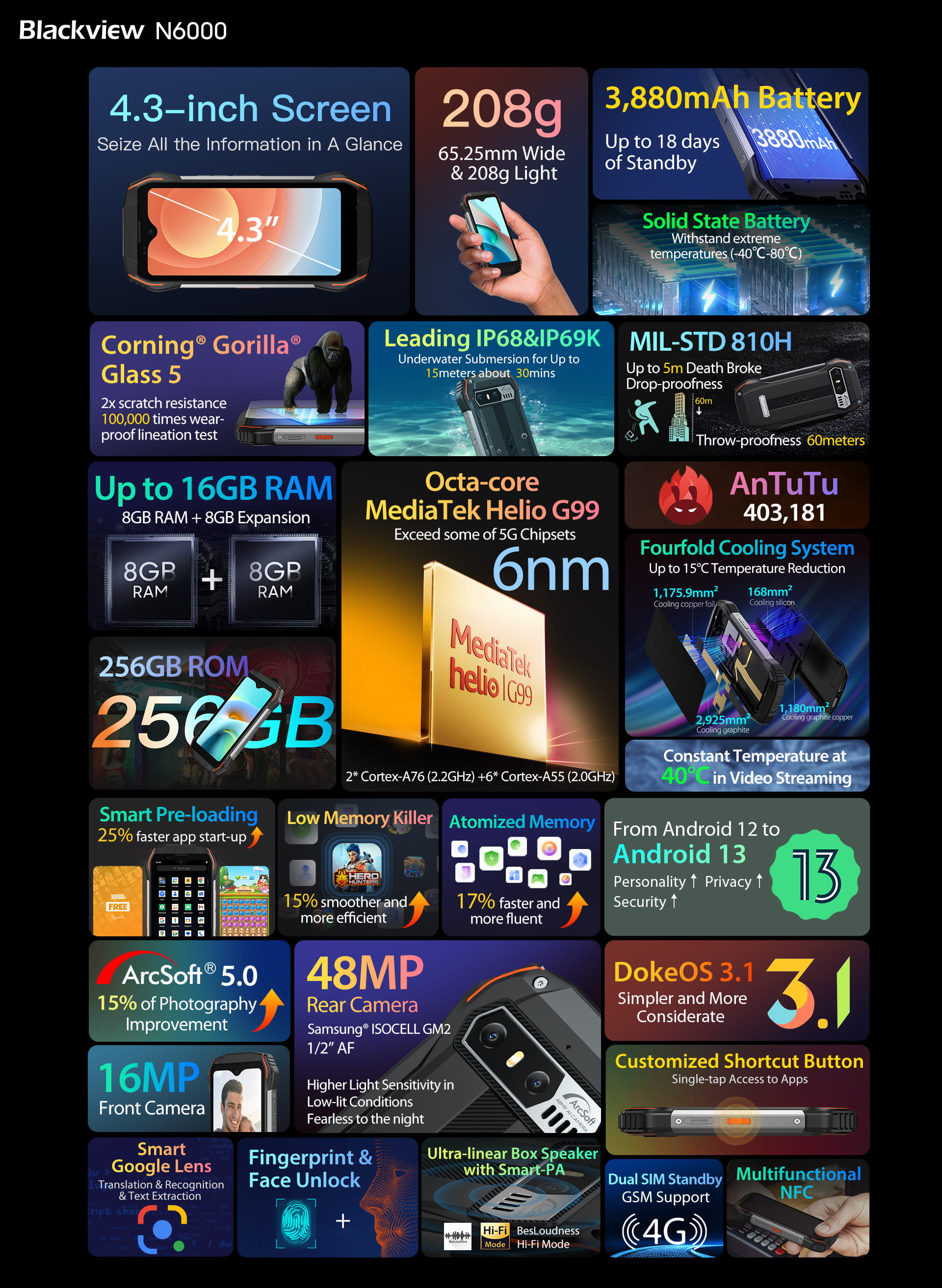 A funkcionalitás érdekében egy 6 nm-es, nyolcmagos MediaTek Helio G99 chipset dolgozik a Blackview N6000-ben, ehhez 16 GB RAM, 256 GB ROM, valamint ArcSoft 5.0-s kettős kamera (16 MP előlapi és 48 MP Samsung ISOCELL GM2), valamint Android 13-on alapuló DokeOS 3.1 található rajta.