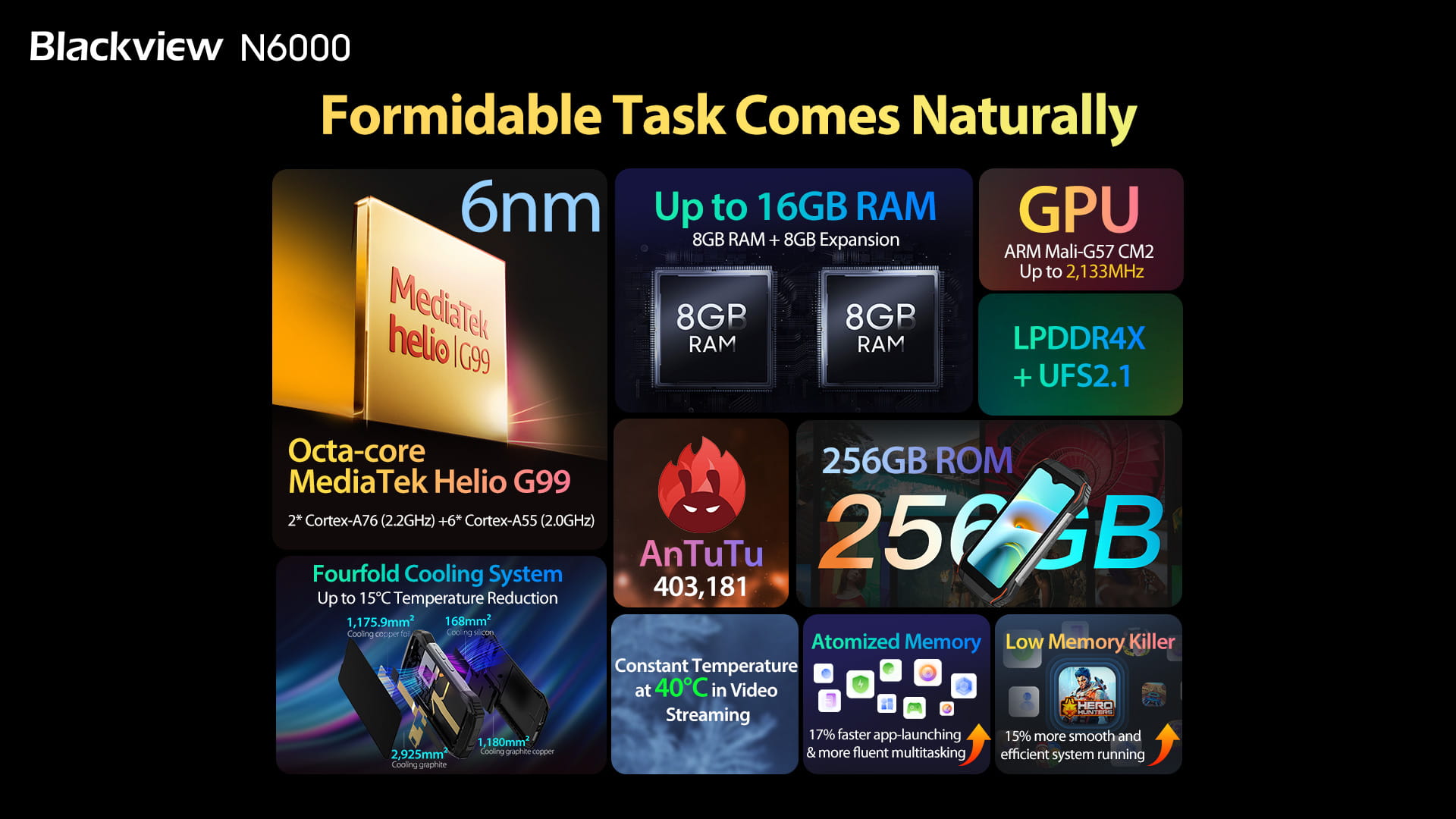 A Blackview N6000 nemcsak külső megjelenésében tartós, hanem belső kialakításában is erőteljes Az újdonság a 6 nm-es nyolcmagos MediaTek Helio G99-et kapta, amely állítólag ugyanolyan gyors, mint az 5G lapkakészlet 2,2 GHz-es 2*Cortex-A76-tal és 2,0 GHz-es 6*Cortex-A55-tel, plusz egy nagy teljesítményű Arm Mali G57 osztályú GPU is tartozik hozzá.