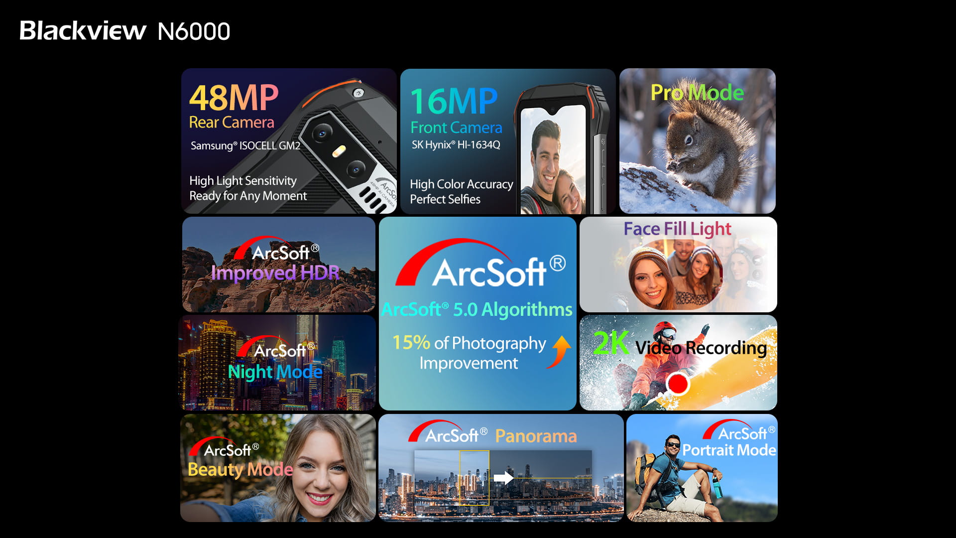 A hivatalos kiszivárogtatások szerint a Blackview N6000 lenyűgöző lesz a fotózásban a 16 MP-es előlapi kamerával és a 48 MP-es Samsung ISOCELL GM2 kamerával, amely ArcSoft 5.0 technológiával rendelkezik a jobb képminőség érdekében.