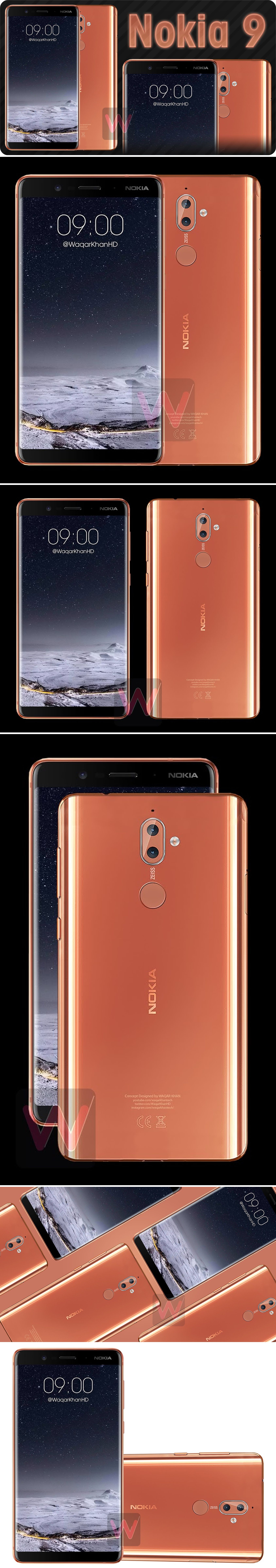 A Nokia 9 szolidan hajlított éleket kap, akárcsak a Nokia 8, de itt nagyjából meg is áll az egyformaság. Teljesen üveg hátlapot használ a HMD Global a csúcsmodellhez, méghozzá vékonyított változatot, hiszen a készülék támogatja a vezeték nélküli töltést. A hátlapra kerül az ujjlenyomat-olvasó, ennek oka, hogy a Nokia 9 OLED kijelzője körül nem maradt hely a szkennernek.
