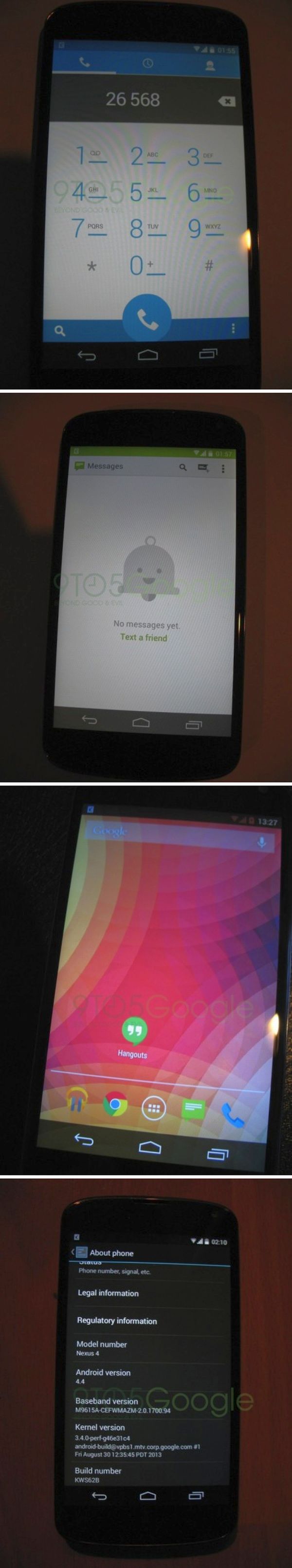 Négy friss fotón mutatjuk be az Android 4.4 KitKat rendszert, egyelőre ennyi szivárgott ki az októberben megjelenő új rendszerről. A screenshotok betekintést nyújtanak a friss verzió némileg megújult kezelőfelületébe, így például a frissített tárcsázó és a szintén új dizájnt kapott üzenetkezelő alkalmazás is látható. Előbbi abszolút világos tónust, míg utóbbi a régi helyett máshova került kezelőgombokat kapott a könnyebb használatért. Az Android 4.4 KitKat várhatóan október második felében debütál a Google Nexus 5 referenciamodellel, valamint a Google Nexus 10 táblagéppel együtt.
