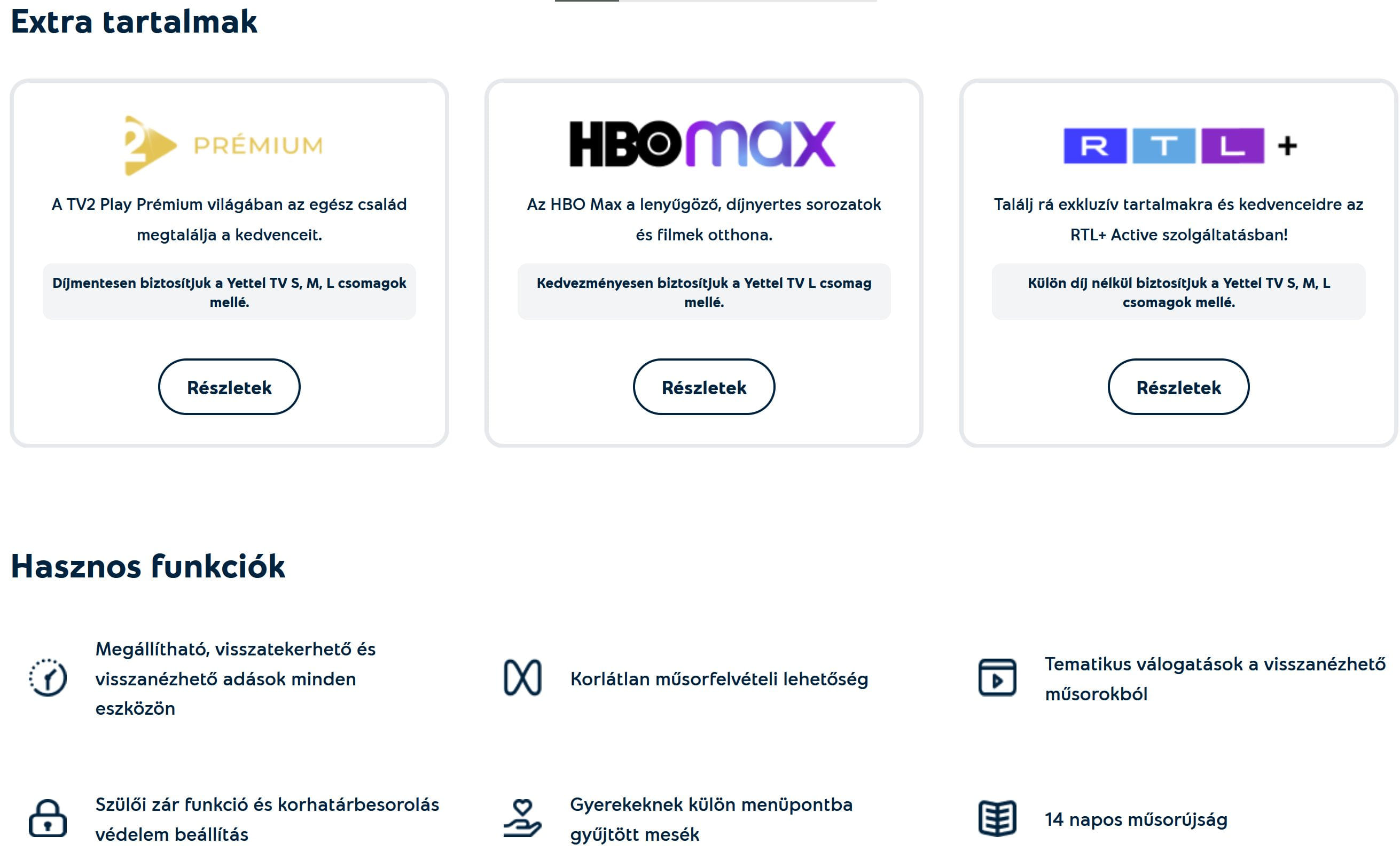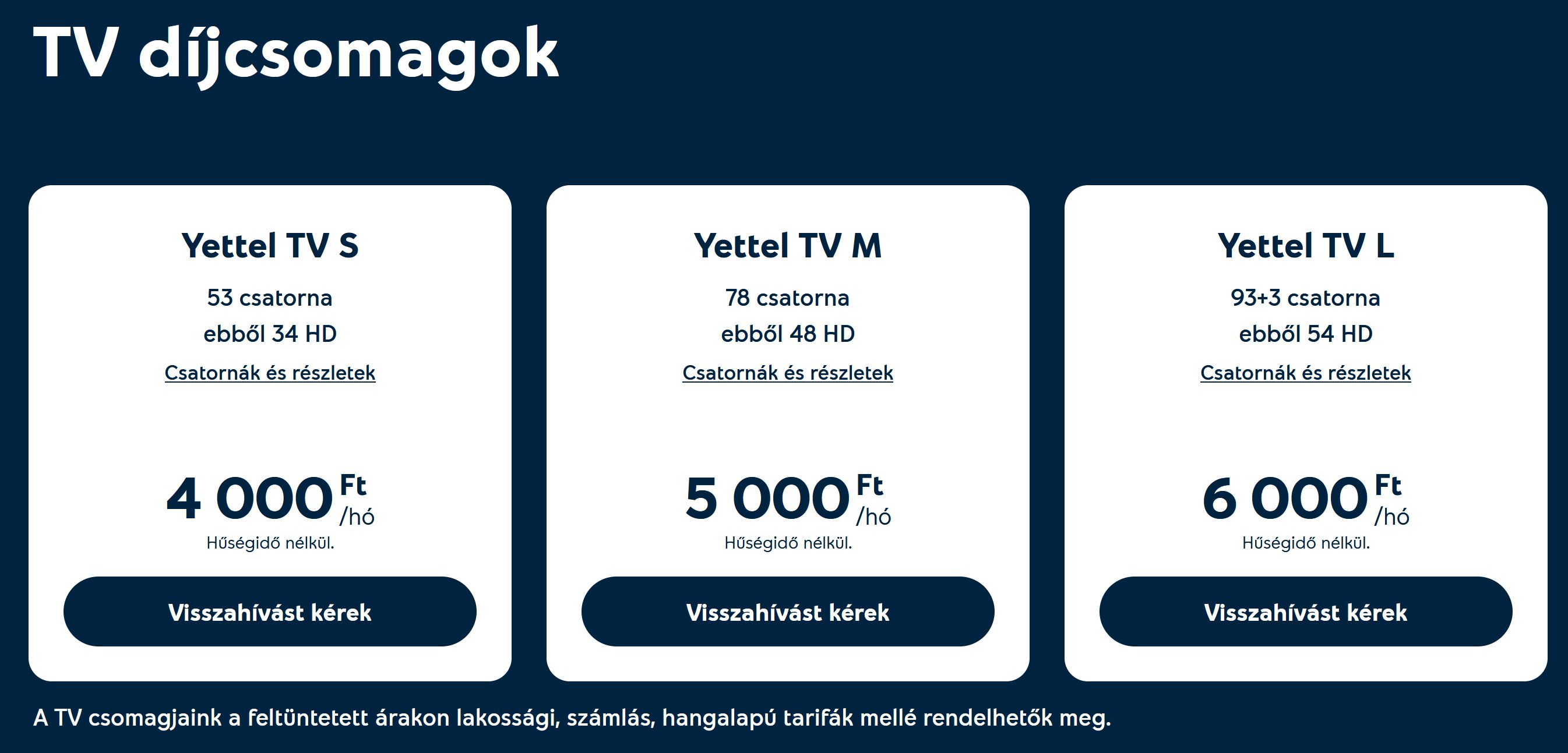 A Yettel TV S, M és L csomagok a legnépszerűbb csatornák mellett az RTL+ Active és a TV2 Play Prémium streamingszolgáltatásokat is kínálják, valamint az HBO Max is megvásárolható melléjük. A Yettel TV-re új OtthonNet vagy OtthonNet Pro tarifák vásárlása esetén 12 havi hűséggel 3 hónapig 0 forintért lehet előfizetni, és május 3-tól az HBO Max is 3 hónapig 0 forintért vásárolható meg.