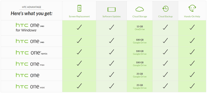 A tajvani gyártó ingyen száz gigabájt tárhelyet biztosít modelljeihez, plusz még négy másik androidos okostelefonhoz a Google Drive-on. Az ingyenes felhő tárhely két évig használható – utána fizetősen lehet igénybe venni a szolgáltatást, amely egyébként a Google drasztikus árcsökkentése óta filléres tétel – és a következő modellekhez jár: HTC One M8, HTC Desire 816, HTC Desire 610, HTC One Max. Sajnos úgy tűnik, aki bármelyik előző HTC modell mellé kapott fél évig ingyenes, ötven megabájt helyet, az az új készülékkel nem tudja azt száz gigabájtra tornázni, csak ha újra elindítja vagy újra telepíti a Google Drive appot a telefonján.