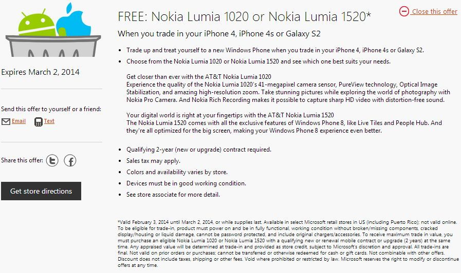 Két napja indította hatalmas akcióját a Microsoft, ahol ingyen kaphat bárki Nokia Lumia 1020 vagy Nokia Lumia 1520 csúcsmobilt bizonyos feltételekkel. Az Egyesült Államokban és Kanadában indult akció keretén belül 250 dollárt kaphat, aki leadja régi okostelefonját vagy tabletjét, valamint Apple iPhone 4, Apple iPhone 4S és Samsung Galaxy S2 mobil leadása esetén választható Nokia Lumia 1020 vagy Nokia Lumia 1520 teljesen ingyen, leszámítva a 2 év hűségszerződés aláírását az AT&T szolgáltatónál. Mindössze annyit kér a Microsoft, hogy a leadott készülék működjön, ne hiányozzon belőle semmi. Az extra ajánlat március 2-án jár le, a Lumia 1520 egyébként 200 dollárba kerül, a Lumia 1020 pedig 100 dollárt kóstál előfizetéssel.