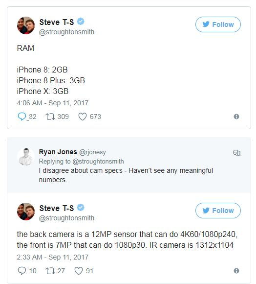 Ezúttal Steve Troughton Smith fejlesztő adott részleteket az új Apple mobilokkal kapcsolatban. Smith szerint az Apple iPhone 8-ba 2 gigabájt RAM, az Apple iPhone 8 Plus és az Apple iPhone X-be pedig 3 gigabájt RAM kerül. Ez egyezik azzal, amit tavaly is követett a gyártó, a kisebbik modell kevesebb RAM-ot kap.