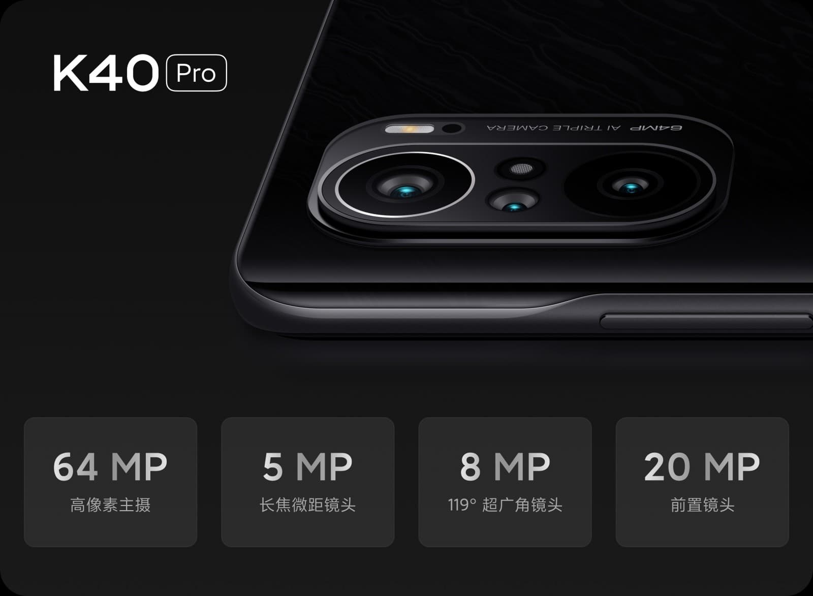 A Redmi K40 Pro 64MP érzékelőt kapott fő kamerájához, 1/1,7”optikai formátumban. Engedélyezi a 4 az 1-ben binning funkciót, a tényleges pixelméret 1,6 µm - nem rossz, de ha a kamera elsőbbséget élvez választáskor, akkor a Pro+ lesz a nyerő. Pozitívum, hogy 8K videót képes rögzíteni 30 kép/mp sebességgel, akárcsak a Pro+.