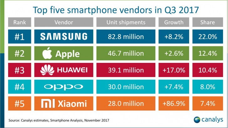A Canalys szerint az iPhone 7 iránti érdeklődés az Apple iPhone 8 megjelenésének és az emiatti árcsökkenésnek köszönhető. Ha a gyártókat vesszük sorra, elég egyértelmű a helyzet, a Samsung vezet a legtöbb leszállított telefonnal, ezzel együtt az egyik legjobb a növekedésben is, de csak a Xiaomi és a Huawei után, a kínaiak ugyanis brutálisan terjeszkednek és növekednek.