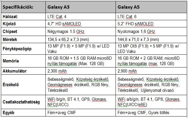 Magyarországon is kaphatók a Samsung Galaxy A szériájának legújabb tagjai. A 4,7 colos A3 és az 5,2 colos A5 készülék is a Galaxy vonalra jellemző prémiumhatású fém-üveg külsőt, valamint számos továbbfejlesztett multimédiás és kényelmi funkciót kapott. A megnövelt akkumulátor-kapacitás, valamint a fejlett elő- és hátlapi kameráknak köszönhetően az A3 és A5 tulajdonosok mindig kapcsolatban maradhatnak barátaikkal, és megoszthatják velük az élményeiket.