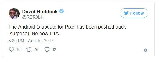 Egy másik bejegyzésben viszont Ruddock megemlíti, hogy az új rendszer nevét augusztus 21-én kapja meg, ekkor lesz Amerika felett teljes napfogyatkozás, ez alapján pedig rögtön a legtöbben a fekete, kerek Oreót jelölték meg befutónak. Az Android O-t a Google Pixel mobilok kapják meg a bejelentés – egyelőre ismeretlen – napján.