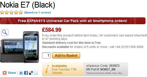 Az Expansys információ szerint január 10-én kerül csak hivatalosan boltokba a telefon. A telefon ára csak rátesz még egy lapáttal, hiszen 695 eurót kóstál a Nokia E7, amely átszámítva mintegy 191 ezer forint, tehát hazánkban gond nélkül kettessel kezdődik majd az összeg.