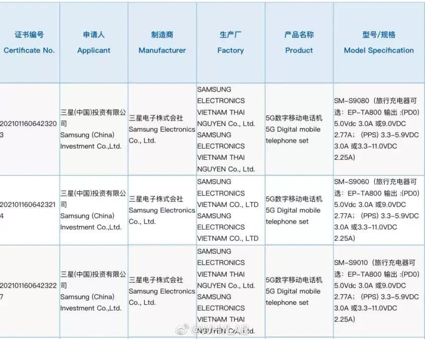 A lista képernyőképe a három SM-S9080, SM-S9060 és SM-S9010 modellszámú telefont mutatja, amelyek a Galaxy S22 sorozat telefonjait képviselik, és az általuk támogatott töltés 25 W (9 V, 2,77A). Ez ellentmond annak, amit a három készülékkel kapcsolatos korábbi hírek állítottak, miszerint csak a Galaxy S22 tölthető ilyen alacsony sebességgel, míg az S22+ és az S22 Ultra 45 W-tal kellene érkezzen.