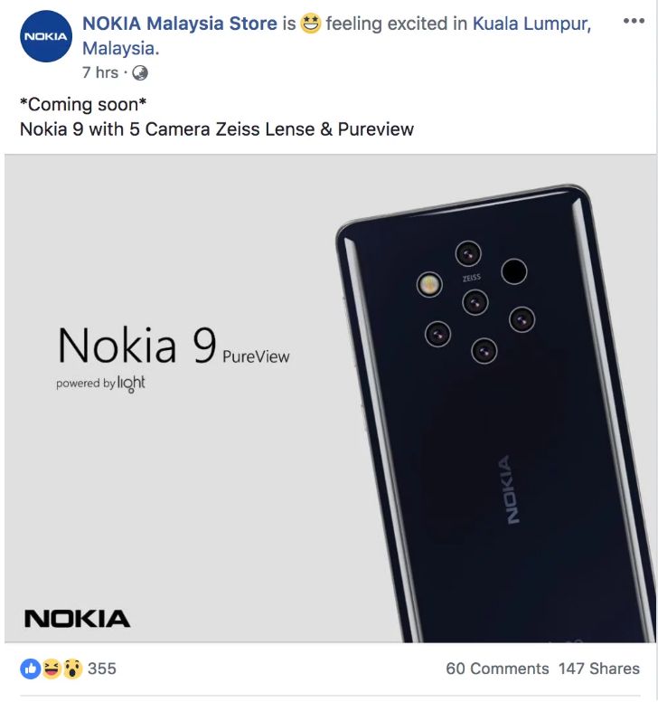 Már mutattuk az igencsak furcsa elhelyezésű kamerákat korábban, azonban ettől fontosabb információ, hogy a modell lebukott a Nokia Malajzia Facebook oldalán, így hamarosan bejelentés várható. Az oldalon a telefon és a „Coming soon. Nokia 9 with Camera Zeiss Lenses & PureView” felirat volt olvasható.