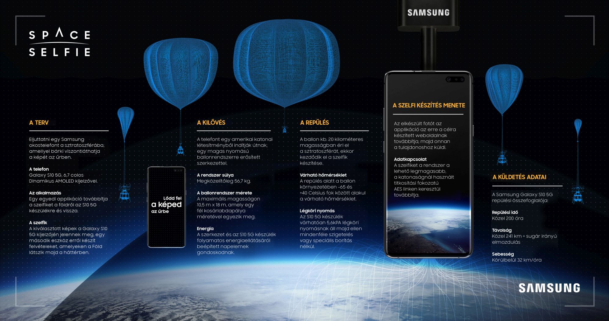 A Samsung bejelentette legújabb, földön kívüli projektjét, az Űrszelfi küldetést, melyben egy Galaxy S10 5G okostelefont küld a sztratoszférába, amellyel a felhasználók a saját képüket is eljuttathatják az űrbe.