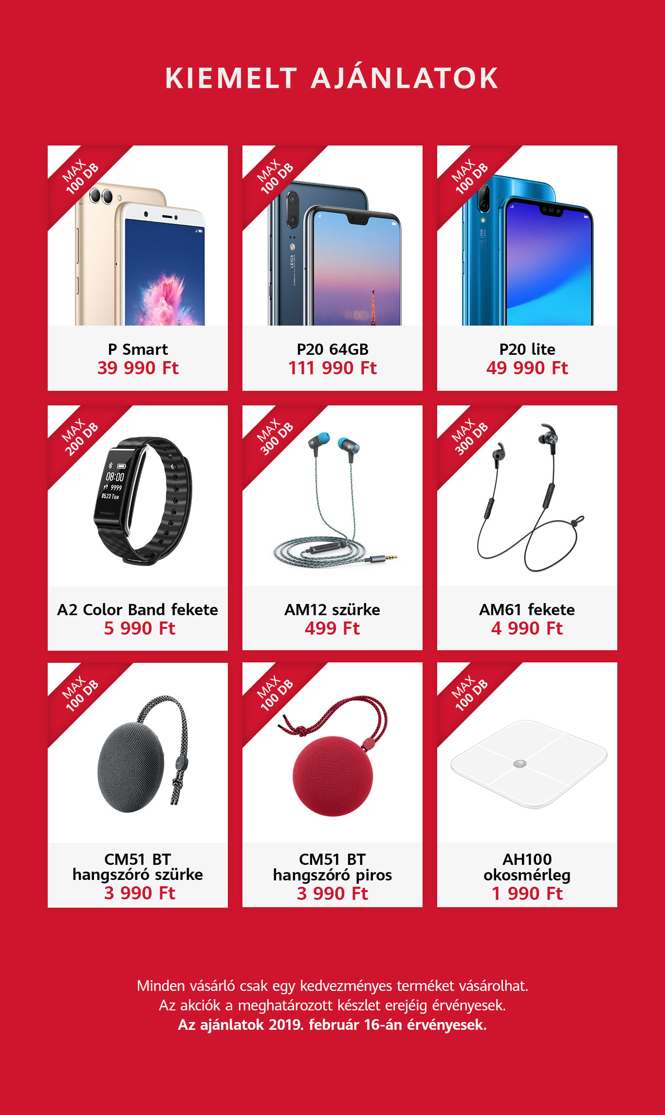 A február 16-án nyíló Huawei Experience Store Magyarországon a gyártó első, de nem az utolsó ilyen jellegű boltja. Az üzletnyitás alkalmából a Huawei márkanagykövetei délelőtt 10 órától kerekasztal beszélgetéssel, nyereményjátékokkal és színes programokkal várják az érdeklődőket. A gyártó kiemelt ajánlataként a látogatók a boltnyitás alkalmából az első 100-100-100 darab készülék erejéig kihagyhatatlan áron vásárolhatják meg a P széria készülékeit és hatféle, szintén limitált mennyiségben kapható okoskiegészítőjét. A Huawei vezeték nélküli hangszórói mellett, telefonnal szinkronizálható okoskarkötőit és okosmérlegeit, illetve kétféle fülhallgatót is vonzó áron érhetik el a megnyitó napján a boltba látogatók.