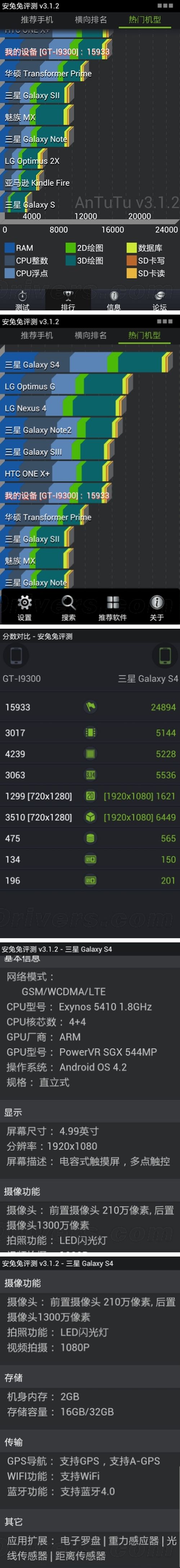 Az Antutu app-pal tesztelt Samsung Galaxy S IV-ben meglepő módon Exynos 5410 CPU található, mely magonként 1.8 gigahertzen ketyeg és összesen nyolc mag található benne (ebből négy képes ezen a maximum órajelen dolgozni, a másik négy az alacsonyabb igénybevételnél az akkumulátor üzemidőt kímélendő, kisebb órajelű). Ehhez a CPU-hoz egy PowerVR SGX 544MP grafikai gyorsítót társítottak, valamint Android 4.2 Jelly Bean rendszert. A modell egyébiránt biztos, hogy 5 colos, 1920×1080 pixel felbontású, HD kijelzőt kap, elérhető lesz természetesen a GPS, a Wi-fi, a Bluetooth, de feltehetően 13 és 2.1 megapixeles kamera, 2 gigabájt RAM és 16/32 gigabájt beépített tárhely is elérhető lesz.