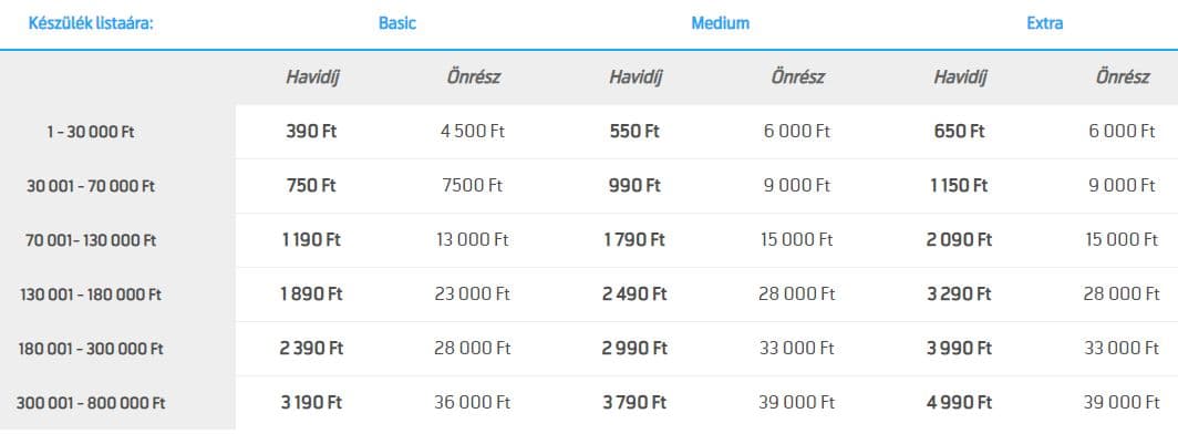 A készülékbiztosítás akár már havi 390 forinttól elérhető és az újonnan kötött biztosításokra automatikusan egy hónap havidíj-kedvezmény jár, azaz a biztosítás díját csak a második hónaptól kell fizetni. A biztosítás havi összege az adott telefon, táblagép vagy kiegészítő esetében is a készülék értékétől és a választott biztosítási csomagtól függ.