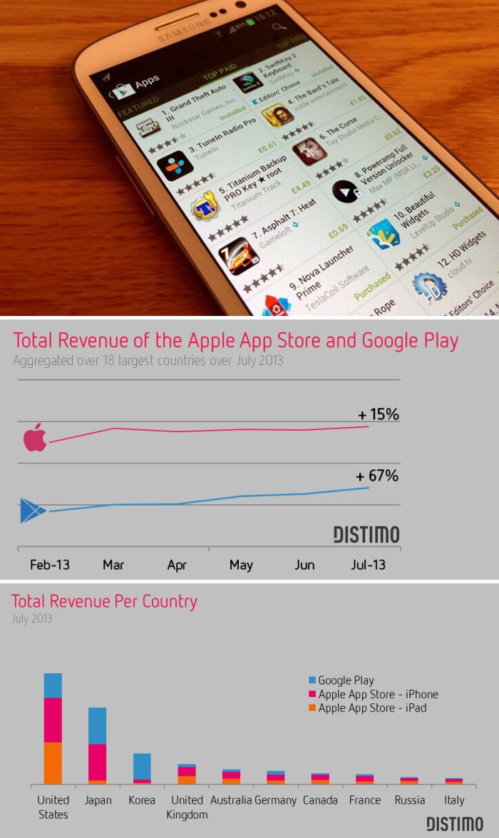 A friss statisztikai adatok szerint a Google Play online tartalomáruház immár nagyobb mint az Apple-féle App Store. Alig pár hete tájékoztatott az App Annies, hogy az Android rendszerű mobilok egyre nagyobb letöltési számot generálnak, de az Apple letöltéseihez tartozó bevételek még mindig a duplája a konkurens platforménak, tehát jobban megéri iOS-re fejleszteni. A Distimo adatai azt mutatják, hogy az elmúlt hat hónapban a Google Play Store bevétele hatvanhét százalékkal nőtt, ebből tizenegy százalék csak a múlt hónapé. Más részről az Apple-nél nem látható növekedés, az elmúlt fél évben az App Store mindössze tizenöt százalékkal nőtt, ebből három százalék az utolsó harminc nap. A nemzetközi vizsgálatok egyértelműen ugyanazt állítják mint az App Annie, miszerint az Egyesült Államok és Japán jelenti a legnagyobb bevételt az App Store-nek, míg a Google Play-nek szintén, ám Koreából is komoly összegek folynak be a letöltésekből és alkalmazás-vásárlásokból.