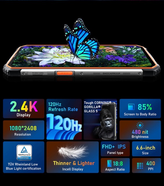 A Blackview BV9200 szemet gyönyörködtető kijelzője 6,6 hüvelykes nagy képernyővel rendelkezik, amely támogatja a 120 Hz-es nagy frissítési frekvenciát és a 2,4K nagy felbontást, így határok nélküli, élénk vizuális élményt nyújt. A 310 g-os könnyű és 13,66 mm-es karcsú testtel három színválasztékban - fekete, narancssárga és zöld - ügyesen megmunkált dizájnt is kínál a felhasználóknak. Hogy a felhasználók teljes mértékben élvezhessék a szembarát élményt, a BV9200 kijelzője a TÜV Rheinland Low Blue Light tanúsítvánnyal rendelkezik, amely segít csökkenteni a káros kék fényt a vizuális képminőség romlása nélkül. Emellett a strapabíró CORNING® GORILLA® GLASS 5 kijelzője strapabíró képernyővédőként működik a karcolások és az 1,2 méteres esések ellen.