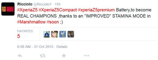 Egy Ricciolo1 nicknevû Twitter felhasználó szerint a Sony Xperia Z5, a Sony Xperia Z5 Compact és a Sony Xperia Z5 Premium Stamina módja egyaránt sokkal jobb lesz az Android 6.0 Marshmallow frissítés után, így a 2900, a 3430, illetve a 2700 mAh-s telepek akár két napig is kihúzzák majd egy feltöltéssel és átlagos vagy komolyabb használattal együtt is.