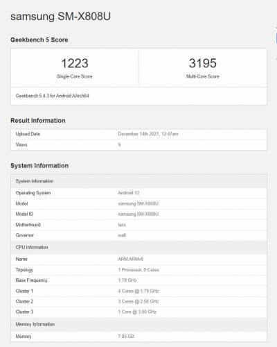 A készülék az SM-X808U azonosítót viseli, és 1223 pontos egymagos kimenetet ért el, míg a többmagos teszt eredménye 3195 pontot ért el. Azt is észrevehetjük, hogy az eszköz 8 GB RAM-mal rendelkezik, és valószínűleg Android 12 hajtja, a tetején One UI 4-el. A Tab S8+ várhatóan 12,4 hüvelykes, 120 Hz-es AMOLED panellel és 10 090 mAh-s akkumulátorral érkezik.