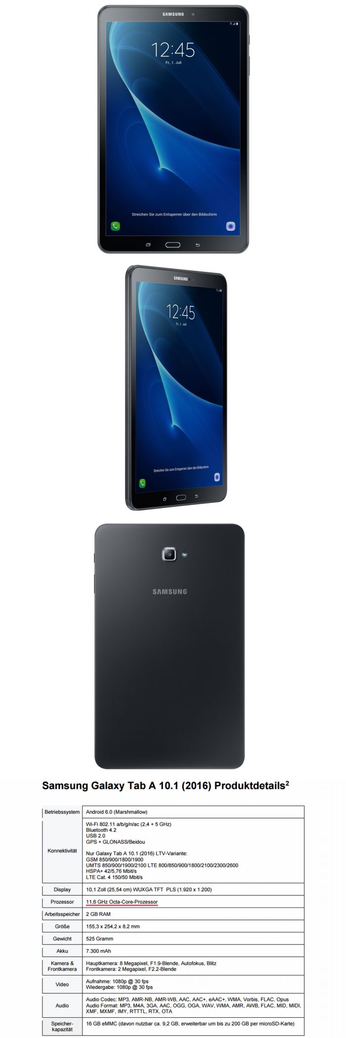 Néhány hónappal a Samsung Galaxy Tab A 7.0 (2016) után ma végre lerántotta a leplet a cég a nagyobb kijelzővel felvértezett változatról is. A Galaxy Tab A 10.1 nem túl meglepő módon 10.1 colos kijelzővel, 1200×1920 pixel felbontással, valamint gyárilag Android 6.0 Marshmallow rendszerrel érkezik. A megfelelő gyorsaságról a nyolcmagos, 1.6 gigahertzes órajelre skálázott Exynos 7870 processzor és 2 gigabájt RAM gondoskodik. A Samsung Galaxy Tab A 10.1 155.3×254.2×8.2 mm, a burkolat alatt egy 7300 mAh-s akkumulátor rejtőzik.