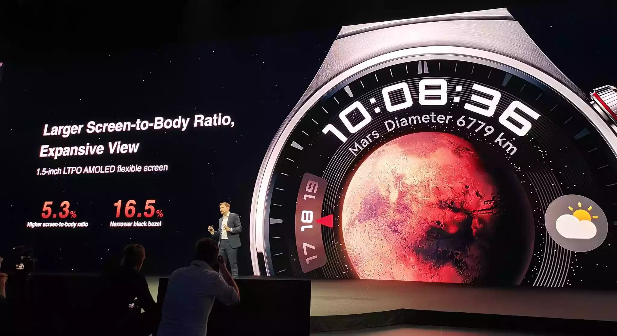A Huawei Watch 4 sorozat nagyméretű, 48 mm-es változatban érkezik. A Pro modell hatalmas, 1,5 hüvelykes LTPO AMOLED hajlékony kijelzővel rendelkezik. Ez 5,3%-kal magasabb képernyő-test arányt és 16,5%-kal keskenyebb keretet jelent, mint elődje esetében.