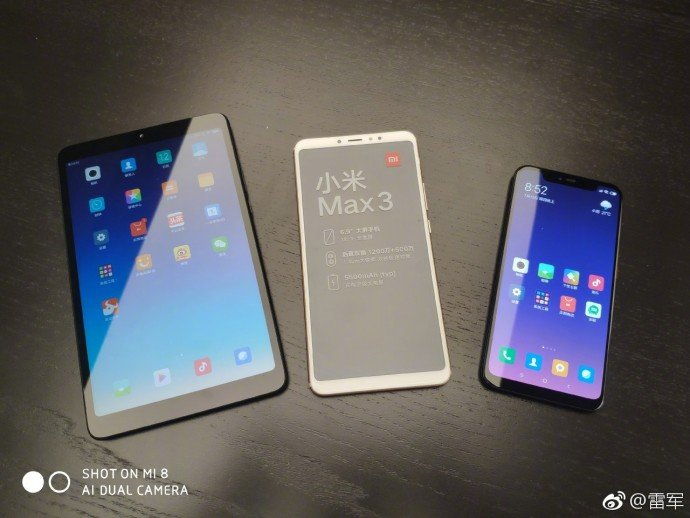 A Xiaomi Mi Max3 a gyártó valaha volt legnagyobb kijelzővel rendelkező telefonja. Az alábbi fotókon a Xiaomi Mi 8 és a Xiaomi Mi Pad 4 tablet mellett látható. A Mi Max 3 hatalmas, 6.9 colos, full HD+ kijelzővel felszerelt, a burkolat alatt egy 5500 mAh kapacitású telep rejtőzik, extraként akár power bankként is működik, más készülék tölthető róla, igazán ritka funkció.