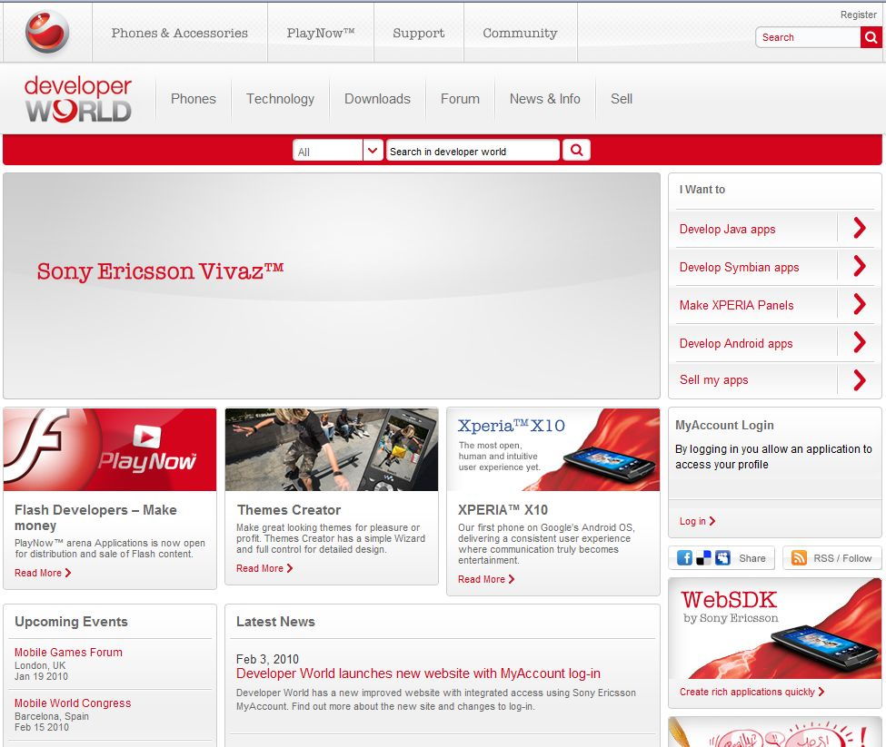 A frissített portál azonban nemcsak külsõleg újult meg, hanem immár több funkciót is tartalmaz, úgymint könnyebben elérhetõ dokumentációt és eszközöket és még hatékonyabb keresést. A Developer World felhasználói neveket immár integrálták a Sony Ericsson MyAccount fiókokkal, így könnyen elérhetõ minden opció egyetlen bejelentkezés után.