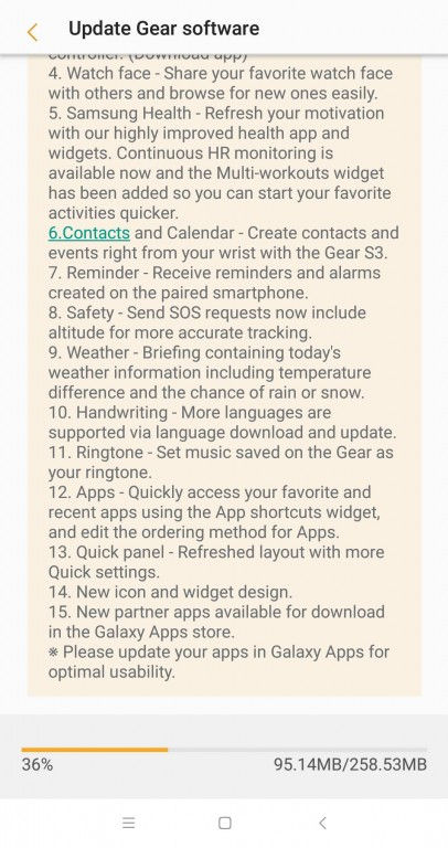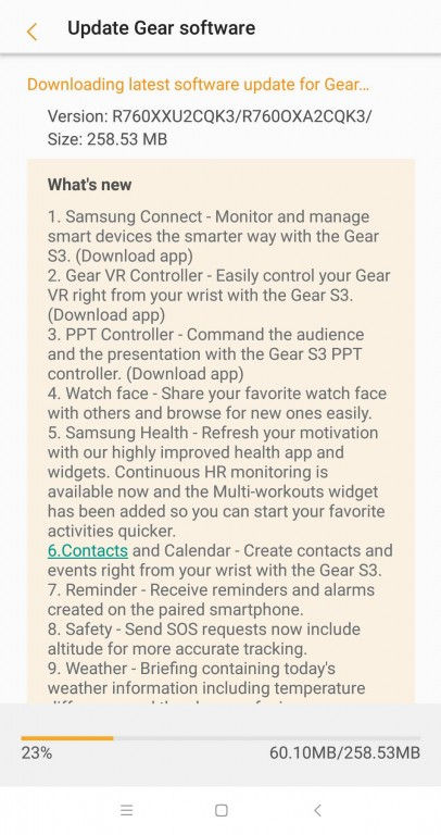 A Tizen OS legújabb változata mellett Value Pack funkciók is belekerültek a sokak által használt okosórába, emellett több, felhasználóbarát widget is elérhető lett. A Samsung Gear S3 a frissítés után már tudja kezelni önmagában is a Samsungos IoT készülékeket, például a Samsung Gear VR-t is a Samsung Connect segítségével. Az új funkciók között elérhető a PowerPoint kezelés óráról, a még több watch face megjelenése és megosztási lehetősége, valamint a Samsung Health új változata, mely lehetővé teszi a folyamatos pulzusmérést és ehhez kapcsolódóan sokkal részletesebb adatokkal szolgál, mint korábban.