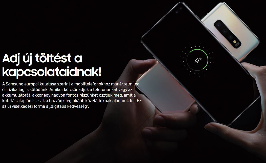 A Samsung Galaxy S10 Vezeték nélküli töltésmegosztás funkciójával a felhasználók megoszthatják a telefonjuk töltését más kompatibilis eszközökkel. A megosztott töltöttség olyan értékes alternatív „fizetőeszköz” lett, amely a társas kapcsolatokra is hatással van. A Samsung kutatásának több mint 6 500 európai résztvevője szerint egy feltöltött akkumulátor értékes ajándék a modern hétköznapokban.