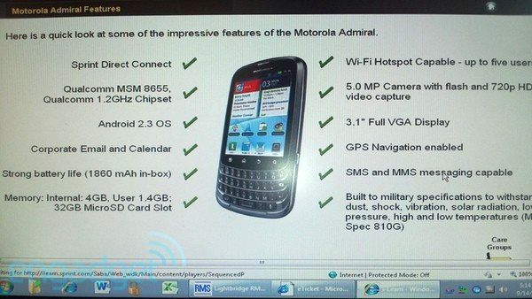 Az amerikai gyártótól ezúttal egy kissé szokatlan külsejű mobil bukott le, amely a Motorola Admiral nevet kapta. A feltehetően ebben a formában csak az Egyesült Államokban piacra kerülő készülék a Sprint szolgáltatónál mutatkozik majd be. Az Admiral érdekessége a négysoros, előlapi QWERTY billentyűzet, a 3.1 colos, VGA felbontású, kapacitív érintőkijelző, valamint az alatta még helyet kapott érintőgombok. A készülékben a Qualcomm egymagos, 1.2 gigahertzes MSM8655 processzora dolgozik, a hátlapi kamera öt megapixeles, amellyel 720p videókat is rögzíthetünk, valamint adott egy 1860 mAh-s akkumulátor. A CDMA hálózaton működőképes készüléken Android 2.3 Gingerbread operációs rendszer fut majd megjelenésekor, amelynek idejét még nem tudni.