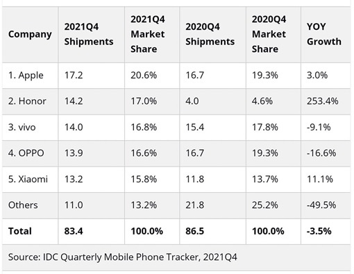 Az IDC mobiltelefonokra vonatkozó negyedéves jelentése alapján a HONOR 2021 utolsó negyedévében felülmúlta a várakozásokat, és 253,4%-kal növelte a leszállított termékek számát Kínában az előző évhez képest. Ezzel az ország második legnagyobb okostelefon-márkája lett, az Android operációs rendszert futtató okostelefon-márkák között pedig az első helyen szerepel, köszönhetően a több mint 14,2 millió leszállított okostelefonnak. Az év egészét nézve a HONOR 38,6 millió telefont szállított le, túlszárnyalva a 2020-es adatokat, amivel az öt legnagyobb gyártó között szerepel.