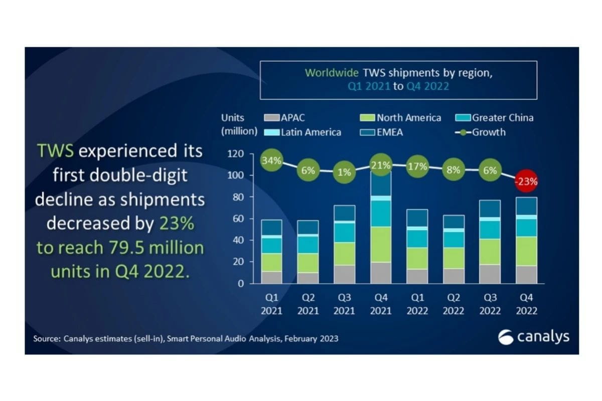 A Canalys által összegyűjtött és közzétett legfrissebb globális adatok szerint a TWS (true wireless stereo) szállítások világszerte 79,5 millió darabot tettek ki a 2022 október-decemberi időszakban, ami első pillantásra bizonyára nem tűnik túl alacsony számnak.
