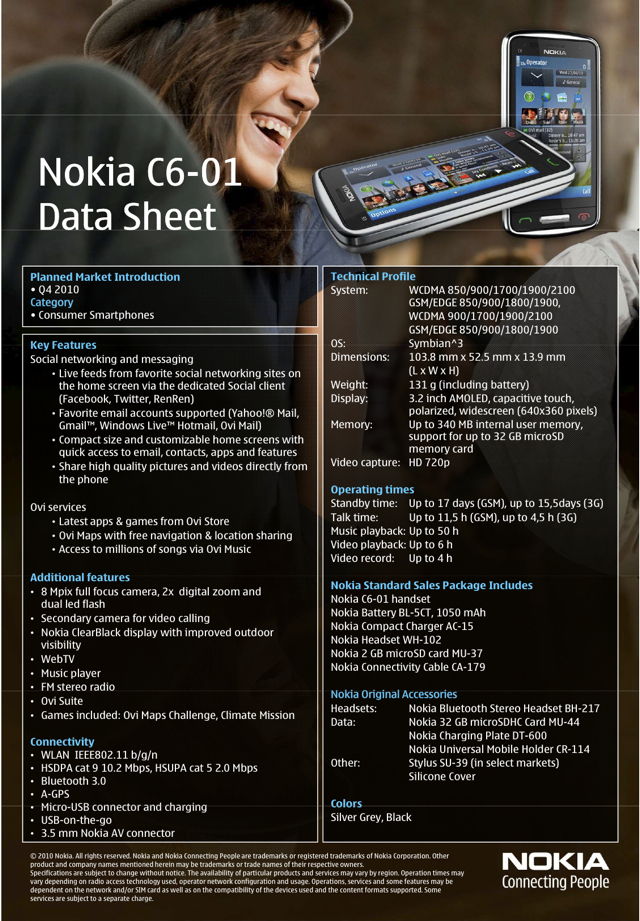 A 10.5 mm vékony Nokia C7 modellben viszont egy 3.5 colos, 640×320 képpont felbontású, kapacitív, AMOLED érintõkijelzõ dolgozik, míg a Nokia C6-01 megjelenítõje mindössze 3.2 colos. Érdemes megemlíteni még a beépített FM-transzmittert, az elõlapi kamerát esetében. A Nokia C7 335 eurós nettó áron lesz elérhetõ, míg a Nokia C6-01 nagykereskedelmi ára 260 euró. A teljes tudáslista alant olvasható.