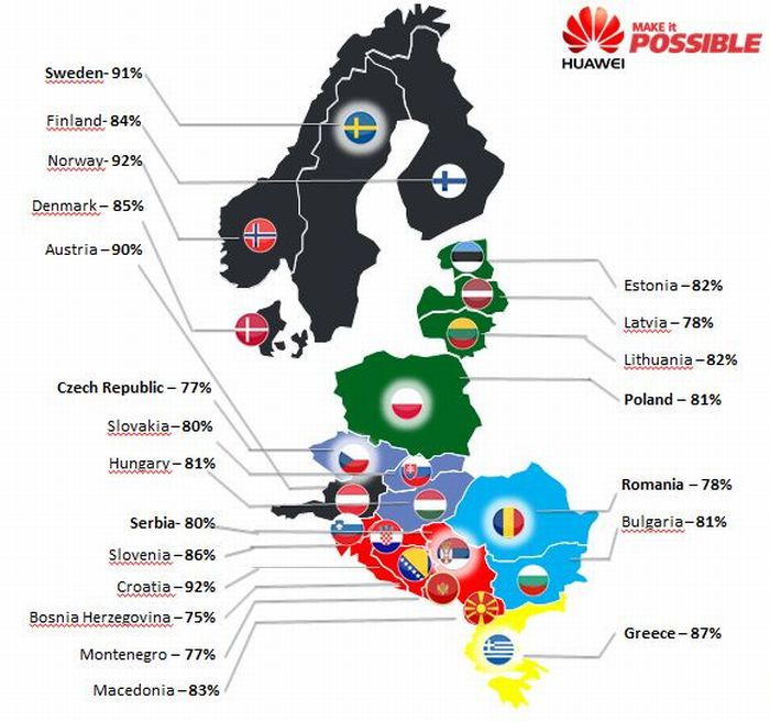 Az internethasználó hazai lakosság több mint 80 százalékának van okostelefonja, és további közel 10 százalék tervezi, hogy a jövőben vásárol ilyet - derült ki abból a most publikált kutatásból, amelyet az Ipsos piac- és közvélemény-kutató cég a Huawei számára készített 21 közép-, dél- és észak-európai országot magába foglaló régióban, beleértve hazánkat is. A kutatás során arra keresték a választ, hogy melyek a megkérdezettek okostelefon-vásárlási és használati szokásai, valamint mik a készülékekkel szemben támasztott legfontosabb igényeik, illetve elvárásaik. Az online felmérést a 18 és 50 év közötti, az internethasználó lakosságot reprezentáló mintán végezték el 2015 áprilisában.