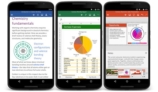 A Microsoft hivatalosan is megjelentette a már nem béta állapotú Microsoft Office for Android programcsomagot. A Word, Excel és Powerpoint appokat tartalmazó csomagot májusban mutatta be a redmondi óriás, azóta csak a béta állapotú preview volt tesztelhető. Fontos tudni, hogy legalább 1 gigabájt RAM és Android 4.4 KitKat rendszer szükséges a futtatásukhoz. Akik rendelkeznek Office 365 előfizetéssel, azok az Office minden szolgáltatását maximálisan kihasználhatják. Az Office szinkronizálható több felhő szolgáltatással, például a OneDrive, a Dropbox, a Google Drive, a Box vagy a SharePoint megoldásokkal. Az Office nyolcvanhárom országban érhető el és tölthető le.