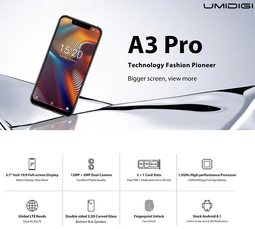 Az Umidigi neve hazánkban is ismert már, a kínai mobilokat kedvelők között pedig kifejezetten népszerű. A gyártó szerint a telefon a belépőszint csúcsa, főleg az akciós Pro változat. Az Umidigi A3 Pro fém keretet, notch-ot és ujjlenyomat-olvasót is biztosít, ez utóbbi a kategóriában még mindig kiemelkedő, hogy van, a dual kamerával együtt.