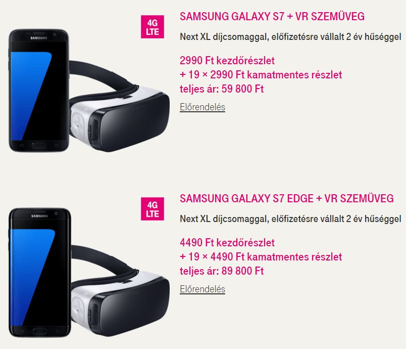 A Vodafone webshopjában már vasárnap éjfélkor indul a vadonatúj Samsung Galaxy S7 és Galaxy S7 edge elõrendelése, jelentette be a Vodafone Magyarország. A két régóta várt modellt a Samsung Barcelonában mutatta be. A Samsung Galaxy S7 (32GB) Red Medium EU X csomaggal, 24 hónapos szerzõdéssel 4 990Ft-ért, a Samsung Galaxy S7 edge (32GB) pedig, szintén Red Medium EU X csomaggal, 24 havi szerzõdéssel 34 990Ft-ért vásárolható meg. Minden ügyfél, aki március 10. éjfélig elõrendeli az új csúcskészülékek egyikét az Online Shopban, egy Samsung Gear VR (virtual reality) szemüveget is kap. A telefonokat a www.vodafone.hu/S7 oldalon lehet elõrendelni: a Galaxy S7 fekete, a Galaxy S7 edge pedig arany színben érhetõ el. A legújabb Samsung okostelefonok a kiskereskedelmi forgalomban március 11-én, pénteken jelennek majd meg.